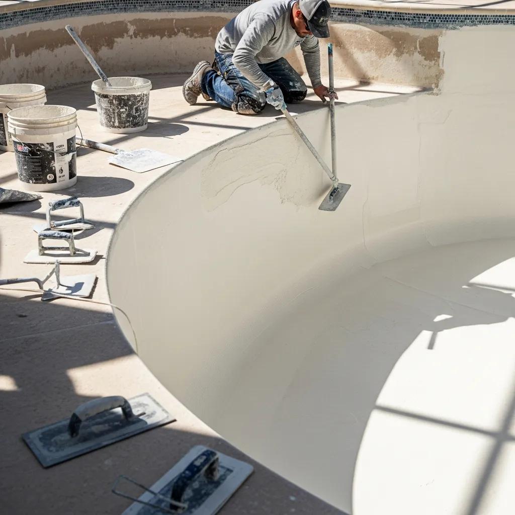 Professional applying new surface layer during pool resurfacing process, enhancing pool longevity and appearance, with tools and materials visible.